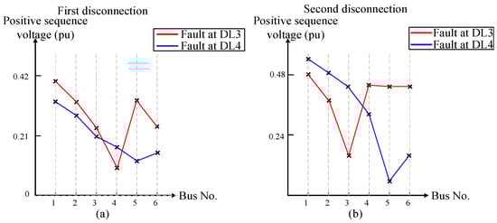 Positive-sequence voltage profile during three-phase fault with one DG connected at bus 3; (a) the first disconnection, (b) the second disconnection.