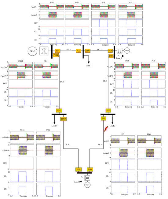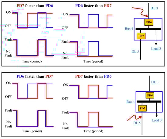 Two signals are utilized in Figure 11. The first is used to switch on and off the PD, while the second is used to indicate whether the PD has detected a fault. As shown in Figure 1, if there is a fault at the end of line 3 (DL3), PD6 and PD7 should disconnect simultaneously since they have the same under-voltage. If PD6 is a bit quicker than PD7, then they should both disconnect. Nevertheless, PD6 will reconnect after a predetermined interval. As shown in Figure 11, PD6 will permanently disconnect, and PD7 will connect after a longer specified time if there is a fault.