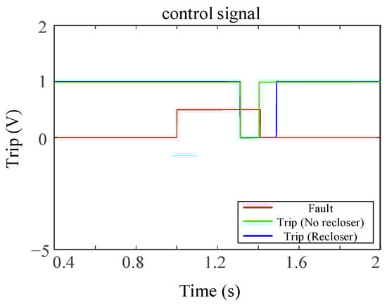 The fault location was at F1 or F2. The difference between simulation and experimental observations throughout steady-state, fault, and recovery periods is 5% for instantaneous abc voltages and 2% for instantaneous abc currents. The protection algorithm of the LO algorithm has been evaluated under both conditions—with and without a recloser. Without the recloser algorithm, the behavior of the LO algorithm for PD2 and PD3 is illustrated in Figure 30. The connections between a DG and the ring grid result in alterations to the values of the positive- and negative-sequence voltages. Figure 31 illustrates how the LO algorithm interacts with the recloser algorithm. Specifically, the recloser algorithm is utilized here.