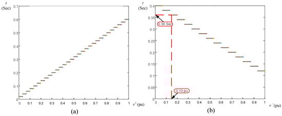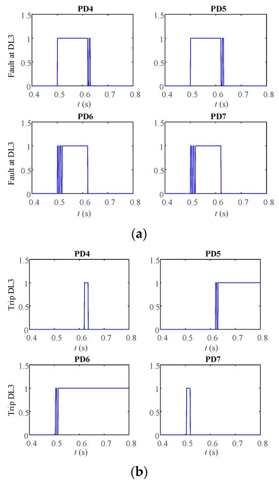 Figure 22 might provide a more accurate understanding of the LO with the recloser procedure when a symmetrical fault happens at DL3. These graphs display all the PDs linked to the buses at the end of the faulty line and trip signals. The protection method depends on the definite time curve corresponding to the positive-sequence voltage, as shown in Figure 22a. Due to their connection to the same bus, the fault signal at PD4 and PD5 is the same bus 3. The PD6 and PD7 linked to bus 4 experienced the same results. The trip signals of the corresponding PDs are shown in Figure 22b. PD6 and PD7 have the first disconnection because they have the same minimum positive-sequence value, and the two PDs are connected to the same bus trip simultaneously. PD4 and PD5 have the second disconnection in this case because their positive-sequence values are higher than the other PDs, PD6 and PD7. Then, after connecting PD6, which is exposed to the fault, the recloser procedure is used, causing it to trip another time. As soon as PD6 is disconnected and PD7 is attached, PD7 is not exposed to the fault and does not trip. The preceding conclusion applies to an unsymmetrical fault; the only difference is that the protection procedure in this situation depends on the negative-sequence voltage.