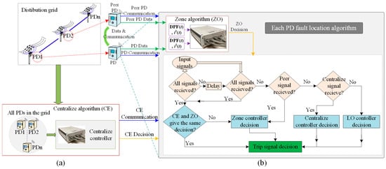 All grid-wide PD data are collected and transmitted to a centralized controller via the CE. Its integration of the entire system’s security into a single device is its primary benefit. However, in the event that data are lost due to inadequate communication, the CE will be unable to pinpoint the precise location of the fault. The ZO, which integrates the data from the two PDs on the same line, is therefore proposed as an outcome of zone control via peer-to-peer communication. In contrast to the CE, which remains fixed to the given grid configuration, this methodology has the capability to accommodate any modifications in the grid. A third protection algorithm, the LO, is proposed that utilizes the local data acquired at each PD to pinpoint the precise location of a fault. Different methods are used based on the fault type, symmetrical or unsymmetrical, calculated using the sequence component. The LO has been suggested to operate independently from the communication between the PD; thus, the protection system can function efficiently in the event of communication loss. The primary benefit of this algorithm is that each PD makes an independent decision, thereby eliminating communication issues. Moreover, each algorithm functions as a redundancy for the others.