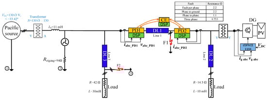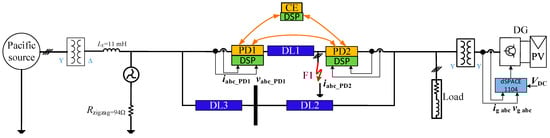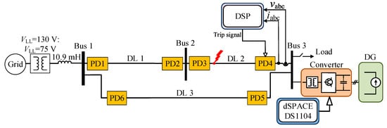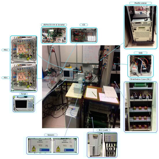 Figure 26 illustrates the experimental laboratory assembly of an equivalent system. The CE and ZO protection algorithms have been implemented using three DSPs of the TMS320F28335 type. ControlDesk and dSPACETM DS1104 were used to implement the inverter control. Utilizing the MatlabTM software, all of the protection algorithms and inverter control have been developed. Due to the absence of DSPs in each line, the data corresponding to the remaining PDs are imposed in the DSP of the CE controller.