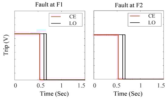 Figure 27 also provides the trip signals for the LO and CE-ZO protection strategies for symmetrical faults when the fault occurs at the F1 and F2. CE-ZO almost gives the same results in this case, while the LO is worse due to the trip curve.