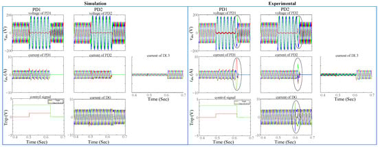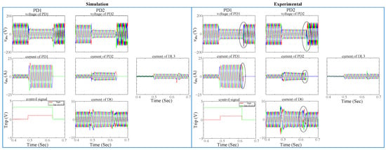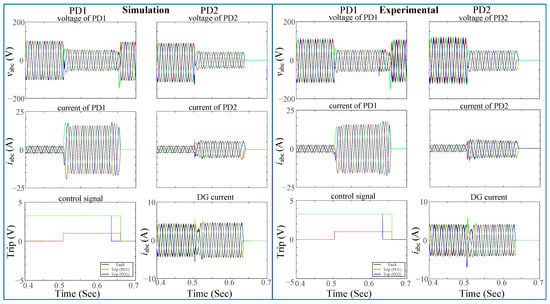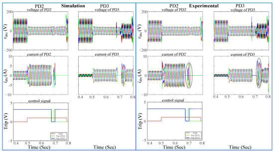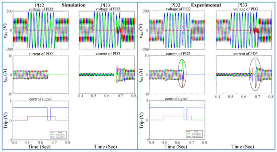 The experimental abc currents of PD1 and PD2 in the second row and third column of Figure 28 and Figure 30, respectively, differ from the simulated result in terms of overcurrent. The substitution of mechanical switches for SSRs in ring grids has caused this. In order to obtain a similar behavior to the experimental results, especially at the disconnection time, a mechanical switch model could be used in the simulation. However, the model of the mechanical switch is out of the scope of this research. The proposed protection algorithms, nevertheless, remain unaffected by this modification, as their operation is not contingent upon the type of switch.