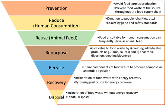 The new Waste Framework Directive proposal requires Member States to implement food waste prevention strategies based on the waste hierarchy framework (Figure 1) in an effort to reduce food waste throughout the food supply chain [13,14]. Adopted in March 2020, Europe’s “Circular Economy Action Plan” focuses on product circularity across its whole life cycle, especially end-of-life treatment [15]. Food waste reduction techniques include (i) reducing the amount sent to landfill, (ii) redistributing food, (iii) treating bio-waste or reusing it as animal feed or fertilizer and (iv) bio-waste treatment measures to decrease the volume sent to landfill [16]. Therefore, as indicated in the frameworks, it is clear that implementing measures to reduce waste and capitalize on by-products and co-products is critical for an effective food waste management system. These measures can improve circularity throughout the food waste management system, while resolving environmental concerns effectively.