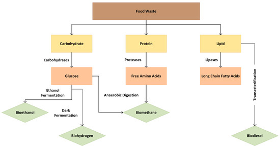 The carbohydrate and protein fractions can be hydrolyzed to obtain fermentable sugars and free amino acids, respectively, while lipids are broken down into long-chain fatty acids (Figure 2). FW energy products include biogas, which can be used for heating and electricity generation; biodiesel and bioethanol, used as automotive or jet fuel; and syngas, which can be further processed into fuels or chemicals. FW processing for energy also produces biochar, a carbon-rich material that can be utilized for soil amendment or energy generation depending on the subsequent treatment.