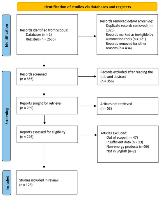 The database of Scopus was chosen to perform the literature review due to its extensive use in scientific research, its advanced search capabilities and the wide range of scientific papers available from various disciplines. The search was conducted in April 2024 using the “title, abstract, keyword” option with the following search string: (“food waste” OR “food loss”) AND (“energy recovery” OR “valorization”). In total, 2636 articles were cross-checked to remove any duplicate publications, using the Mendeley software (Figure 3). Preliminary screening was carried out by reading the titles of the articles and, if required, assessing their abstracts. The selection of studies was based, inter alia, on their relevance, recency and methodological rigor.