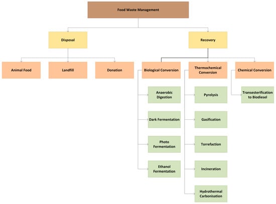 This article includes a comprehensive review on the concept of FL- and FW-to-energy treatment methods, the recovery impacts and the energy yield efficiency of each method. A total of ten energy conversion techniques from organic waste are discussed and categorized into three main categories based on the process’ underlying reactions (Figure 4): (i) thermochemical conversion, (ii) biological conversion and (iii) chemical conversion. The major thermochemical techniques include pyrolysis, incineration, gasification, torrefaction and hydrothermal carbonization. The biological conversion processes discussed are anaerobic digestion, dark fermentation, photofermentation and ethanol fermentation, while chemical conversion is represented solely by transesterification. The complexities and novelties of the aforementioned processes are included to provide insights into sustainable waste management practices, highlighting their potential to enhance the energy recovery efficiency in line with the circular economy principles.