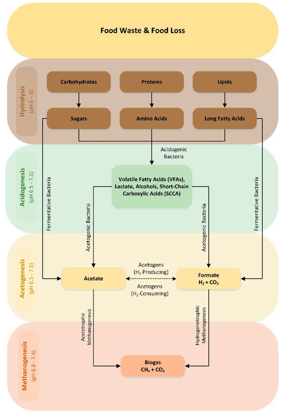 The hydrolysis reaction is catalyzed in the next phase by acidogenic bacteria. During acidogenesis, the substrates generated from hydrolysis are converted into intermediate fermented products. Amino acids, soluble sugars and fatty acids are further decomposed into short-chain carboxylic acids (SCCA), alcohols and volatile fatty acids (VFA) such as acetate, butyrate, isobutyrate, propionate and valerate [60]. The by-products from the acidogenesis process are CO2, H2S and NH3. VFA production is carried out by fermentative microorganisms belonging to the genera of Bacillus, Salmonella, Streptococcus, Escherichia and Lactobacillus [61]. An increase in the VFA concentration is responsible for the pH drop to between 4.5 and 5.5, activating the acidogenic and acetogenic bacteria to produce acids.