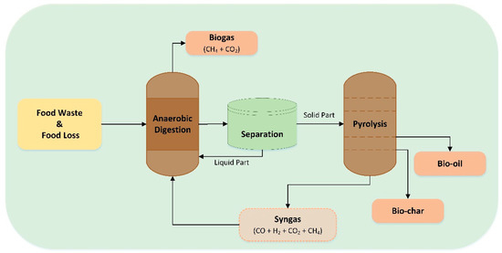 - Inalegwu Okopi, S.; Zeng, J.; Fan, X.; Lu, J.; Cui, J.; Hu, Y.; Wang, J.; Chen, J.; Djandja, O.S.; Ma, Y. Environmental sustainability assessment of a new food waste anaerobic digestion and pyrolysis hybridization system. Waste Manag. 2024, 179, 130–143. [Google Scholar] [CrossRef]