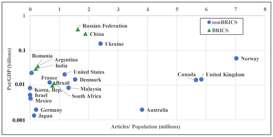 Ratio of patents to GDP versus the ratio of articles to population for BRICS (green triangles) and nonBRICS (blue disks).