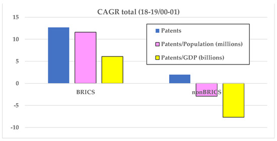 For the BRICS, the CAGR remained positive, regardless of normalization by population or GDP. However, for the nonBRICS, despite the positive CAGR of patents, when normalized by population or GDP, the rate became negative, indicating a systematic trend. To better understand this effect, it is important to analyze what has occurred over these 20 years.