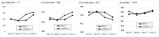 Initially, it was observed that the patterns of specialization and concentration were inversely related to diversification, reinforcing the credibility of our findings. The BRICS remained stable but clearly increased their specialization, concentration, and inequality in the last period. The nonBRICS experienced a decline in specialization in the first period and successive increases in the following periods. In the last period, both exhibited a certain level of stability. On the other hand, the Gini inequality index, which did not allow for the identification of differences for the total 20-year period, although it did not vary significantly over time, it clearly reflected the fluctuations in the other indicators.