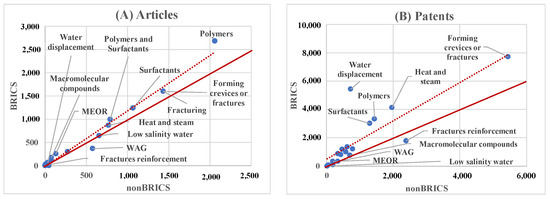 To compare the positioning of each of the 18 EOR methods, two scatter plots were constructed. The vertical axis represented the total number of documents from the BRICS, while the horizontal axis depicted the total number of documents from the nonBRICS for both science (Figure 4A) and technology (Figure 4B). Diagonal lines were added to each plot, marking where the BRICS and nonBRICS would have exactly the same total number of documents.