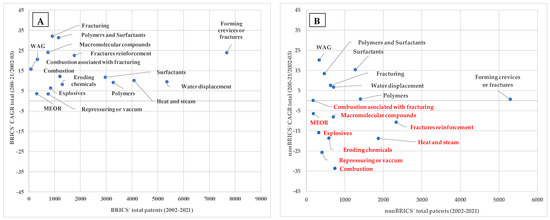 Compound annual growth rate (CAGR) of patents (TRL4–5) for each EOR method as a function of its patents in the 20-year period (2002 to 2021): (A) BRICS; (B) nonBRICS.