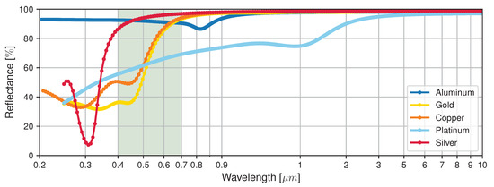 For this reason, the spectral reflectances of five metals, aluminum (Al), gold (Au), copper (Cu), platinum (Pt), and silver (Ag), were selected and compared, having obtained the results illustrated in Figure 1, which shows the characteristics of the five metals for a range of wavelengths from 200 to 10,000 nm [13].