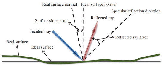 The specularity error is related to defects and imperfections whose characteristic wavelength scale is less than or comparable to that of the solar spectrum. These defects and imperfections lead to the scattering of solar radiation reflected from the surface. Slope error, on the other hand, translates into errors in the vector normal to the incidence surface, which is caused by topographical deviations on a larger scale than the solar spectrum, as illustrated in Figure 2 [14,15].