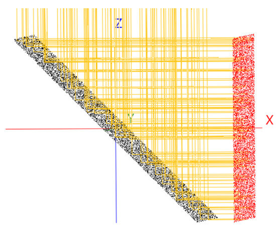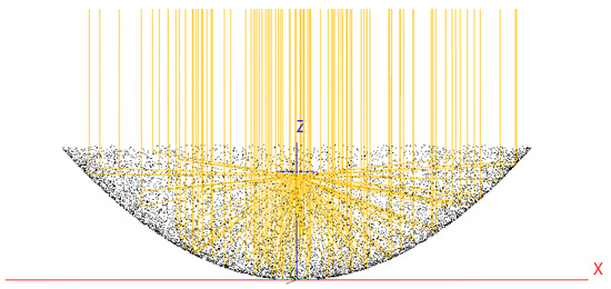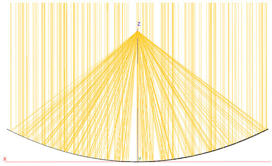 Figure 3 presents the simulation for a flat concentrator. This concentrator is a rectangular reflector, 1 wide by long, and is orientated so that it makes an angle of 135 ° with the XY plane. The receiver is a square of unit area and is perpendicular to the XY plane. The solar rays coming from the fictitious Sun descend on the XY plane, so orientating the concentrator diagonally ensures that the rays are redirected so that they fall perpendicularly on the receiver, increasing the incident power. In other words, the concentrator is oriented at an angle of 135 ° to the XY plane to maximize the number of solar rays falling on the receiver and, consequently, the power incident on it.