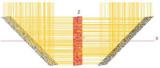 The simulations were carried out via SolTrace, a software tool developed by NREL to model concentrating solar power systems and analyze their optical performance. The SolTrace code uses the Monte Carlo ray-tracing methodology. The user specifies a certain number of solar rays to be traced, and the program generates each ray. The traced rays then travel through the system undergoing optical interactions with the different geometries present there. The traces of the studied geometries are portrayed in the figures presented in this section. The receivers, shown in red in these figures, are rectangles with a unitary area with a length of 100 and a width of .