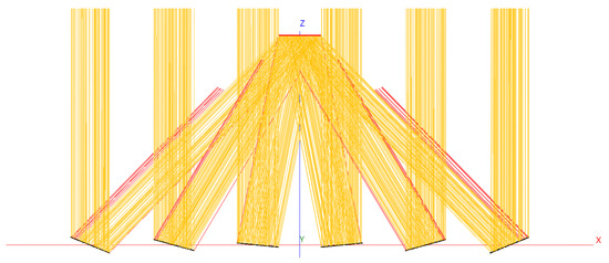 The linear Fresnel reflector (LFR) illustrated in Figure 5 has six reflectors, all square with unitary area, separated from each other by 2 and ordered from left to right; the reflectors are oriented concerning the XY plane, with the following angles: 158°, 164°, 174.5°, 5.5°, 16° and 22°.