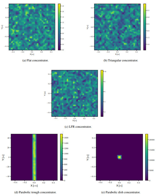 While the previous standard simulation used a unit reflectance for the concentrator’s material, which made it possible to establish a theoretical limit (unattainable in practice), the variation in reflectance influences the power received by the receiver and the distribution of the flux on its surface. In Figure 9 and Figure 10, respectively, the characteristics and the uniformity of the incident radiation distribution in the receiver’s surface for the five studied geometries are represented.