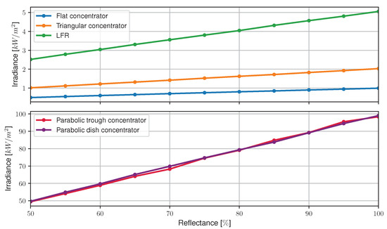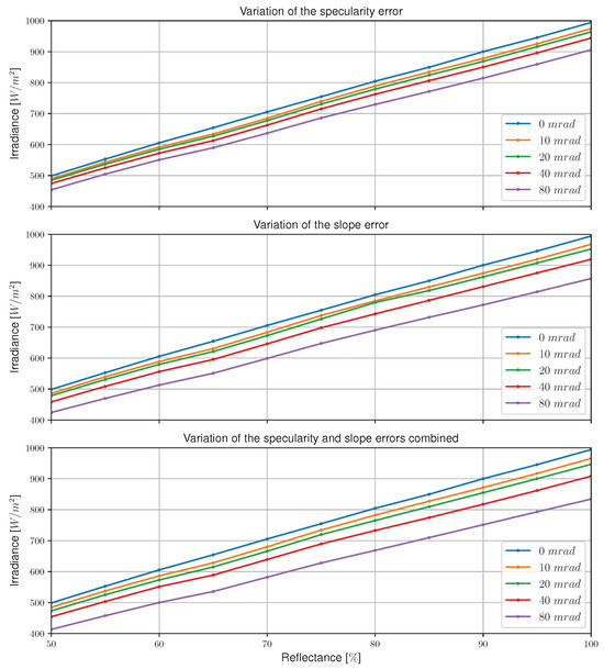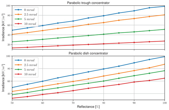 Figure 14 shows the influence that the errors mentioned have on the average irradiance of the receiver surface for flat concentrator reflectance values ranging from 50% to 100%.