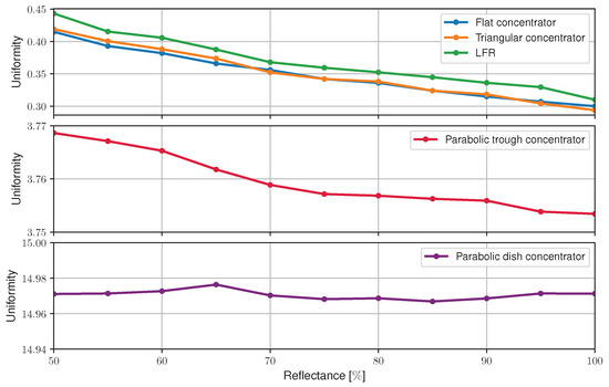 The flat geometries all have a uniformity that varies inversely with the reflectance of the concentrator. It is known that uniformity is given by dividing the standard deviation by the average flux and that a decrease in reflectance causes a decrease in irradiance at the receiver. Thus, a possible explanation for this phenomenon is that, although the standard deviation of the distribution remains the same (since all the irradiance values decrease in the same way), decreasing the reflectance reduces the average flux and, therefore, induces an increase in uniformity.