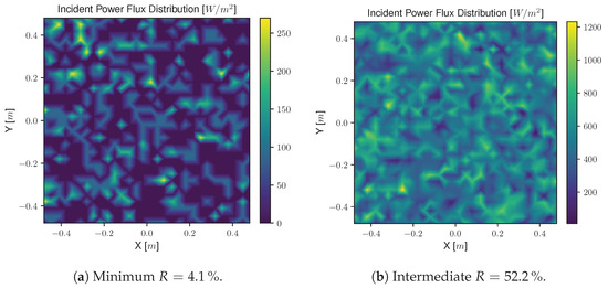 Subsequently, the reflectance of the concentrator’s material was studied. SolTrace allows for the change of this optical parameter in the simulations, thus enabling the comparison of different reflectance values on the incident power and uniformity in the receiver’s surface. Theoretically, the higher the reflectance, the greater the proportion between the radiation flux incident on a surface and the flux that is reflected is.
