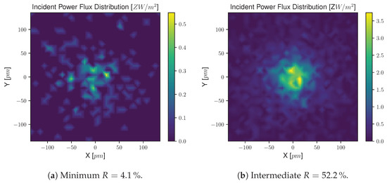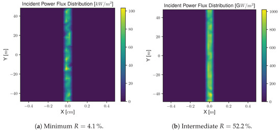 Regarding the flux distribution maps on the surface of the receiver, the results obtained for the three geometries are presented: flat concentrator (Figure 11), parabolic trough concentrator (Figure 12), and parabolic dish concentrator (Figure 13). To avoid redundancy, it was chosen to display only the maps for the lowest reflectance obtained from the five metals studied—the reflectance of aluminum at , with a value of —and an intermediate reflectance—that of gold at , with a value of . This choice intends to emphasize the differences found between the responses for minimum, intermediate, and maximum reflectance (unit reflectance of the ideal standard scenario).