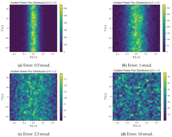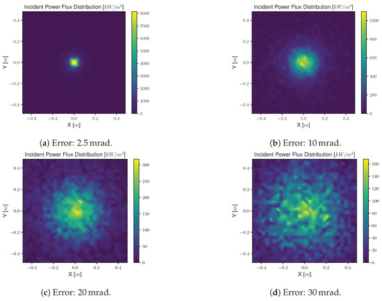 The conclusions drawn for the parabolic dish concentrator are similar to those for the trough concentrator. It should be noted, however, that with the trough geometry, the optical error has to be higher to achieve a dispersion of the incident power similar to that obtained for the parabolic trough concentrator receiver. Perhaps this is because, although both receivers have the same area, the width of the trough geometry receiver ( 10 ) is much smaller than the width of the dish geometry receiver ( 1 ). Therefore, the concentration of the Sun’s rays on the surface of the parabolic trough receiver has to be much more precise, and consequently, a deviation of is enough to see a spread of the radiation on the surface, which is not the case with the parabolic dish concentrator receiver.
