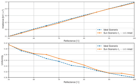 Irradiance and uniformity at the receiver as a function of the reflectance of the flat concentrator, for the ideal scenario and the scenario with a fictitious Sun with a solar half-angle of .