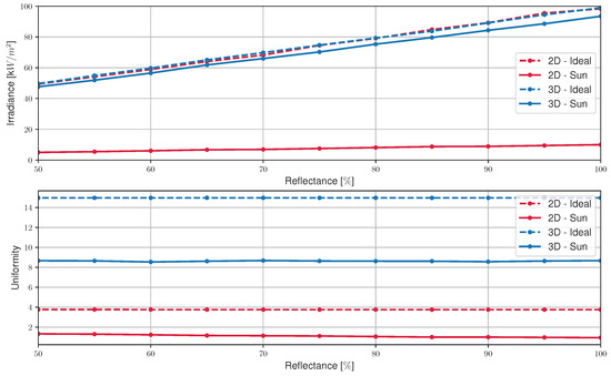 Irradiance and uniformity at the receiver as a function of the reflectance of the parabolic trough concentrator—2D—and the parabolic dish concentrator—3D—for the ideal scenario and the scenario with a fictitious Sun with a solar half-angle of .