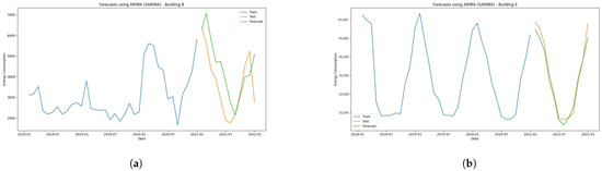 Results for the ARIMA/SARIMA method for building B and complex of buildings E. (a) A time series is characterized by periodicity, but without seasonality, a variable trend (it is not clear). The ARIMA/SARIMA method performed very well. It mapped the time series, shifted by a small time range. (b) The time series is characterized by seasonality and a downward trend. Forecasting using the ARIMA/SARIMA model provided almost perfect coverage with the test data for a given time series.
