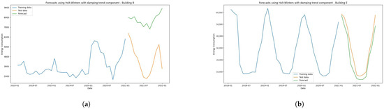 Results for the Holt–Winters method for building B and complex of buildings E. (a) A time series is characterized by periodicity, but without seasonality, a variable trend (it is not clear). Despite attempts to change the parameters, the simpler Holt–Winters model failed to predict the data. (b) The time series is characterized by seasonality and a decreasing trend. For this reason, the simpler Holt–Winters model is more accurate than other models.