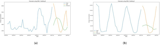 Results for the DNN method for building B and complex of buildings E. (a) A time series is characterized by periodicity, but without seasonality, a variable trend (it is not clear). The DNN artificial intelligence method completely failed to predict the data. It has been averaged and the values look sinusoidal. (b) The time series is characterized by seasonality and a downward trend. The DNN model did not cope at all with forecasting this type of data. The data have been flattened and heavily averaged.