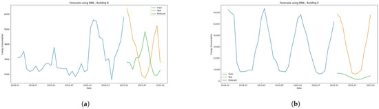 Results for the RNN method for building B and complex of buildings E. (a) A time series is characterized by periodicity, but without seasonality, a variable trend (it is not clear). The RNN artificial intelligence method completely failed to predict the data. The data were shifted in time and not adjusted in large values. (b) The time series is characterized by seasonality and a downward trend. The RNN model gave the worst results of all the methods tested. The obtained data were flattened, below the lowest actual value.