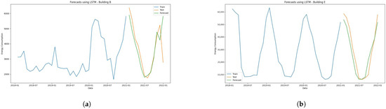 Results for the LSTM method for building B and complex of buildings E. (a) A time series is characterized by periodicity, but without seasonality, a variable trend (it is not clear). The best representation of the forecast was provided by the LSTM method. The obtained result is consistent with the test data. (b) The time series is characterized by seasonality and a downward trend. The LSTM model gave the best results of all three artificial intelligence methods. The results were similar to the Holt–Winters model.