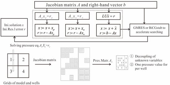 A tailor-made multistage preconditioner is built in view of the above matrix structure characteristics to obtain the pressure, saturation, and molar fraction of every grid. The solver consists of AMG, ILU, GS iteration, and Krylov subspace iteration methods. A composite preconditioner is constructed by combining a non-expansive smoothing operator with a preconditioner (see Figure 1). This preconditioner can quickly and effectively improve the solving speed of the multiphase and multicomponent mathematical model by approximately 2–5 times [,,,].