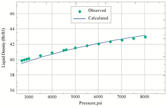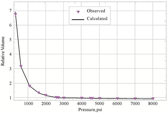 The phase state calculation model is used to fit the equal component expansion experiment after combination, and the changes in the fluid volume coefficient, density, gas-phase viscosity, and oil-phase viscosity of the reservoir are simulated (see Figure 2, Figure 3, Figure 4 and Figure 5). When the reservoir pressure drops from 8000 to 270 psi, the fitting absolute error of the volume coefficient ranges from 0 to 0.1573, and the fitting relative error ranges from 0 to 2.33%. When the reservoir pressure decreases from 8000 psi to above the saturation pressure, the absolute error in fitting crude oil density ranges from 0.000497 to 0.10049 g/cm3, and the relative error in fitting ranges from 0.0075% to 0.7039%. When the reservoir pressure drops from 2300 to 108 psi, the absolute error of the gas-phase viscosity fitting is 0.0002~0.0009 mPa·s, and the relative error of fitting is 1.14~6.31%. When the reservoir pressure drops from 2300 to 108 psi, the absolute error of the liquid viscosity fitting is in the range of 0.0005~0.02 mPa·s, and the relative error of the fitting is 0.19~4.02%. According to the above simulation results, the fitting precision of the constant component expansion experiment is high, which meets the requirements for the simulation calculation.