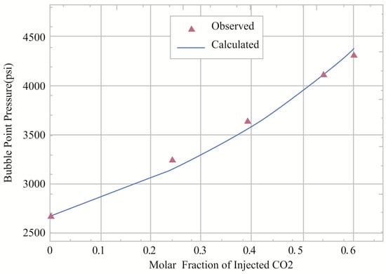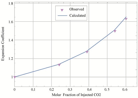 It is imperative to investigate the impact of CO2 injection on the reservoir fluid phase. The model mentioned above is utilized to accurately determine the saturation pressure, volume coefficients, and other parameters in swelling tests. Specifically, the bubble point pressure and expansion coefficient of the reservoir fluid vary as the mole fraction of the injected carbon dioxide changes (refer to Figure 6 and Figure 7). The results from the simulation indicate that the relative error in fitting the bubble point pressure across various carbon dioxide mole numbers falls within the range of 0.1% to 5.77%. Additionally, the relative fitting error for the expansion coefficient at different CO2 mole numbers ranges from 0% to 2.37%. The simulation result, i.e., the saturation pressure and the volume coefficient of the swelling test, has high fitting precision and meets the requirements of component simulation calculation.