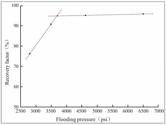 A one-dimensional numerical simulation model for slim-tube experiments was established using the parameters from the indoor tubule experiment (see Table 3). The grid size of the model is 100 × 1 × 1, the grid step in the X direction is 1.219 cm, the grid size in the Y and Z directions is 8 cm, the porosity is 29%, and the permeability is 3000 × 10−3 μm2. The first section (1, 1, 1) of the model is an injection well, and the end (100, 1, 1) of the model is a production well. By simulating the recovery factor of the reservoir with the injection of 1.2 PV of CO2 under various displacement pressures, the recovery factor curve can be plotted (refer to Figure 8). The pressure at which the curve reaches a turning point represents the minimum miscible pressure of the reservoir fluid.