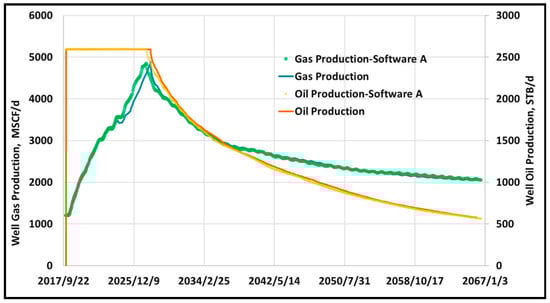 The multiphase and multicomponent numerical simulator calculated 50 WAG cycles. Figure 9 shows the daily oil and gas production curve of one production well and the comparison with the results of commercial software A, which is typically used by reservoir engineers. Based on the comparison, the calculation results of this model show no significant deviation from those obtained using mainstream commercial software A.