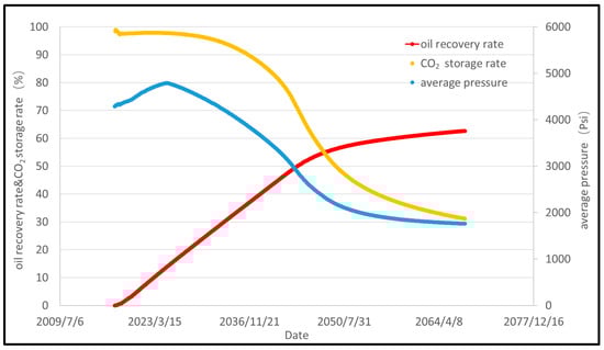 Change curves of oil recovery rate, CO2 storage rate, and pressure vs. time.