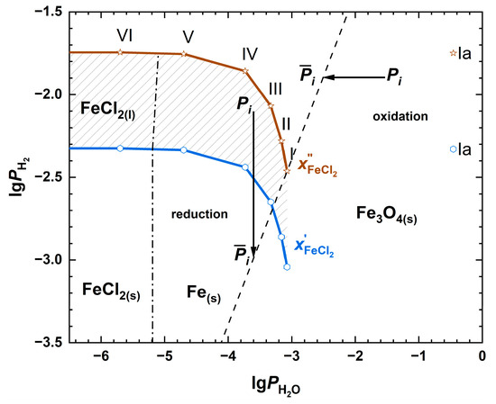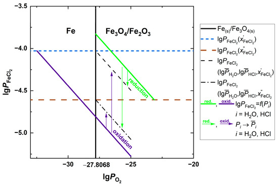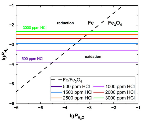 It follows that HCl(g) acts synergistically on the metal surface to form solid iron chloride with a high tendency towards volatility (FeCl2(s) → FeCl2(g)) as well as being a source of H2(g) formed at the interface of (Fe(s)–Fe3O4(s)). Calculations in the supplement (Tables S8 and S9) show that the pressures of the generated hydrogen increase proportionally with the partial pressure of HCl(g) and in the technological concentration range = 500–3000 ppm are at the level of = 132–4745 ppm. Gaseous hydrogen with water vapour diffusing to the metal surface defines, through the equilibrium concentration ratio , the reducing and oxidising region of the gas phase for the reaction