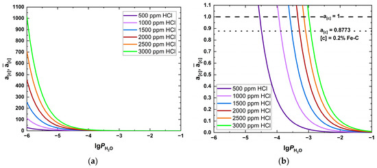 (a) Carbon activity values calculated for various pressures of H2O(g) and HCl(g); (b) close-up of the carbon activity values. , for = 500–3000 ppm.