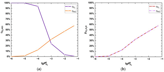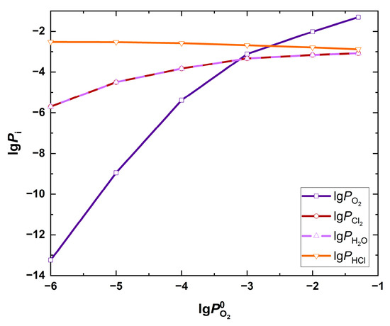 The determined parameter introduced into the vector equations (Equation (8)) allows the equilibrium composition of all gas-phase components to be determined. Calculations were performed for a temperature = 800 K and a total system pressure of = 1 atm. The equilibrium composition of the gas phase resulting from the oxidation of hydrogen chloride, depending on the initial oxygen conditions prevailing in the system, is given in Table 7 and graphically illustrated in Figure 3.