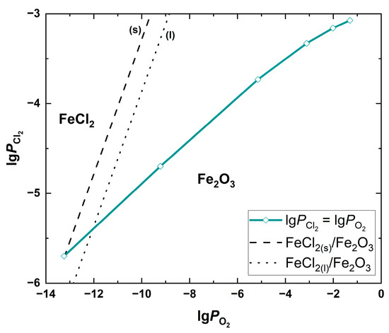 The stability of oxide phases (Fe3O4(s), Fe2O3(s)), chloride phases (FeCl2(s)) and pure Fe(s) at a given temperature depends on the partial pressures in the gas phase. The stability ranges of iron compounds in the (Fe-O-Cl) system were determined for a temperature of = 800 K, and a thermodynamic view of this issue is given in the supplement (Tables S3–S7) omitting the FeO(s) phase as not stable at this temperature. Protection of iron against both chloride-induced and oxide-induced corrosion at 800 K is possible at lower concentrations for chlorine atm. and oxygen atm. The generation of a chloride phase in contact with pure haematite (FeCl2(s)/Fe2O3(s)) is possible at oxygen pressures of atm. However, this requires a chlorine pressure in the reaction space of atm. Under the technological conditions of biomass combustion in power boilers and laboratory experiments [28,30,31,32,33,34], the oxygen concentration in the gas phase fluctuates around 5%, while HCl(g) ranges from 500 to 3000 ppm. These are values indicating that the stable phase under these conditions is the Fe2O3(s) phase, and oxide corrosion is the dominant phenomenon in this gas-phase concentration region. The equilibrium gas-phase composition of the reaction space (HCl(g), O2(g), Cl2(g), H2O(g)) determines the course of the Deacon reaction of hydrogen chloride oxidation, generating chlorine and water vapour, intensified by the catalytic action of iron oxides (Table S2):