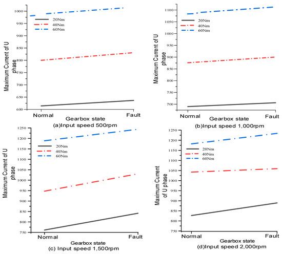 Figure 5, it can be seen that the U−phase current increases with the increase in load regardless of whether the gearbox is in the normal or wear state. For example, at a speed of 1000 rpm and a load torque of 40 Nm, the peak current in the normal state is 8.75 A, and when the input torque reaches 60 Nm, the current is 10.8 A; in the same situation, when the gearbox teeth are worn, the peak current rises from 9.1 to 11.2 A. In addition, in all test conditions, gearbox tooth wear failure results in an increase in the peak motor current under identical load conditions. For instance, when the motor speed is 500 rpm and the load torque is 20 Nm, 40 Nm, and 60 Nm., the corresponding peak motor U−phase peak circuits are 6.12 A, 8.21 A, and 9.76 A, respectively; with peak currents increased by 0.25 A, 0.24 A, and 0.19 A, respectively, when the gears are faulty compared to peak currents under normal conditions. Similarly, when the load torque is 20 Nm, 40 Nm, and 60 Nm at 2000 rpm, the corresponding peak U−phase currents of the motor are 8.15 A, 10.46 A, and 11.75 A, respectively; and the peak U−phase currents increase by 0.28 A, 0.15 A, and 0.74 A, respectively, when the gear tooth surface fails.