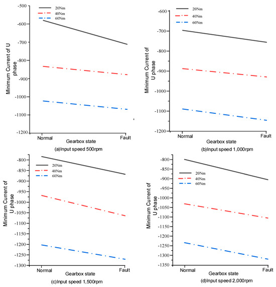 Figure 5, under the same load conditions, the gearbox tooth wear faults lead to an increase in the peak motor current assignments, which in turn makes the minima smaller. For example, when the torque is 20 Nm, 40 Nm, and 60 Nm, respectively, with a speed of 500 rpm, the corresponding peak motor U−phase peak currents are −5.92 A, −8.10 A, and −10.12 A, respectively. After gear wear, the peak currents are −1.62 A, 0.28 A, and 0.20 A, respectively, which are less than those in the normal state. When the motor speed is 2000 rpm and the load torque is 20 Nm, 40 Nm, and 60 Nm, the corresponding peak motor U−phase peak currents are −7.68 A, −10.61 A, and −12.25 A, respectively. These peak currents are reduced by −0.31 A, −0.21 A, and −0.25 A, respectively, compared with those of the normal state after the gear failure. This result is consistent with the theoretical study in the previous section.