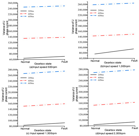 Figure 7, it can be observed that regardless of whether the gearbox is in a normal state or in a worn state, the U−phase current variance increases as the load increases. For instance, in the normal state, when the drive motor speed is 1500 rpm and the torque is 20 Nm, 40 Nm, and 60 Nm, the variance values are approximately 80,560, 14,980, and 260,522, respectively. Furthermore, the rotational speed exerts a relatively minor influence on the variance. To illustrate, when the speed is 500 rpm, 1000 rpm, 1500 rpm, and 20,000 rpm, respectively, with a load torque 40 Nm, the corresponding variance values are 78,600, 79,860, 80,260, and 80,658, which exhibit minimal variation.